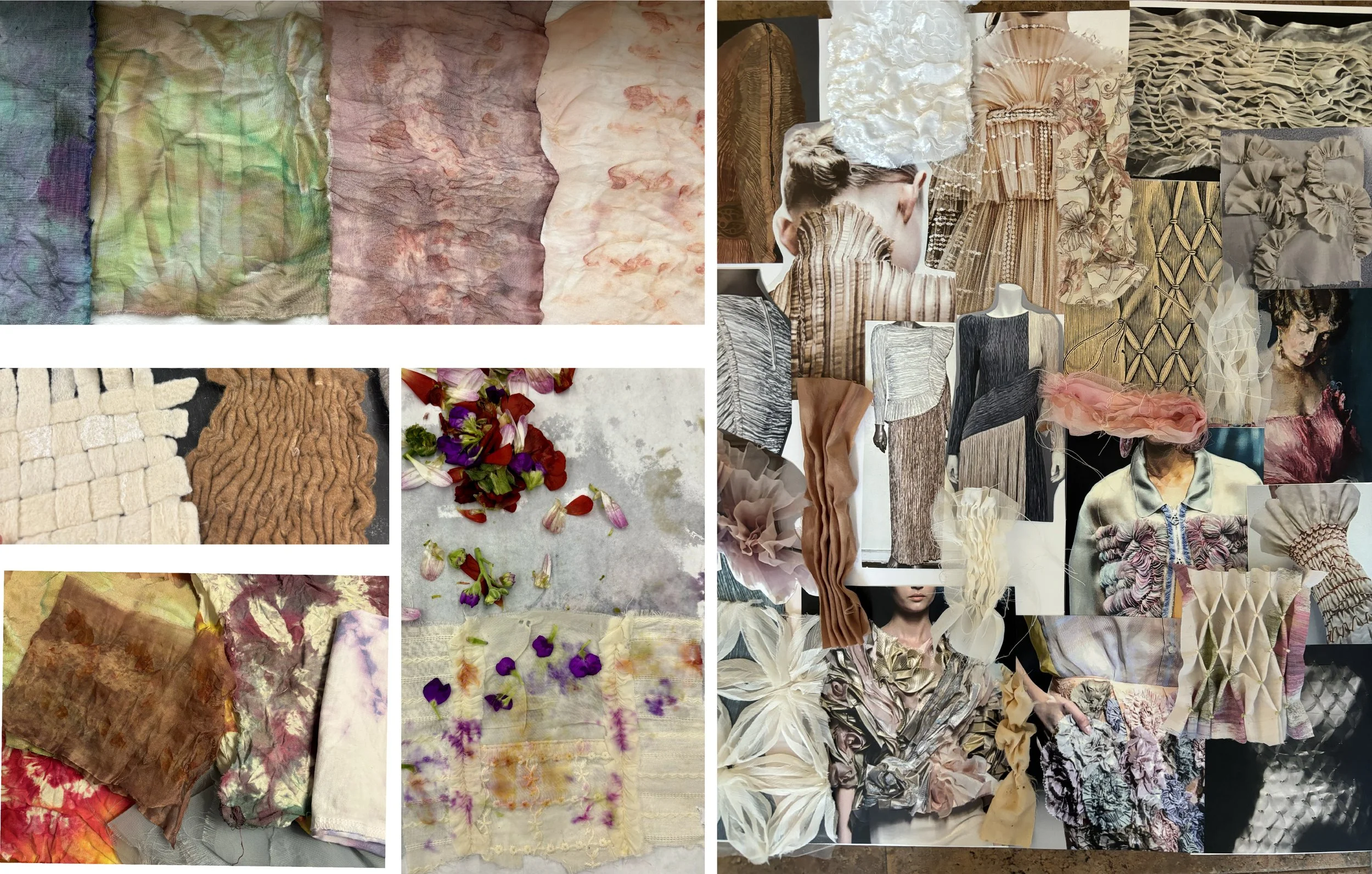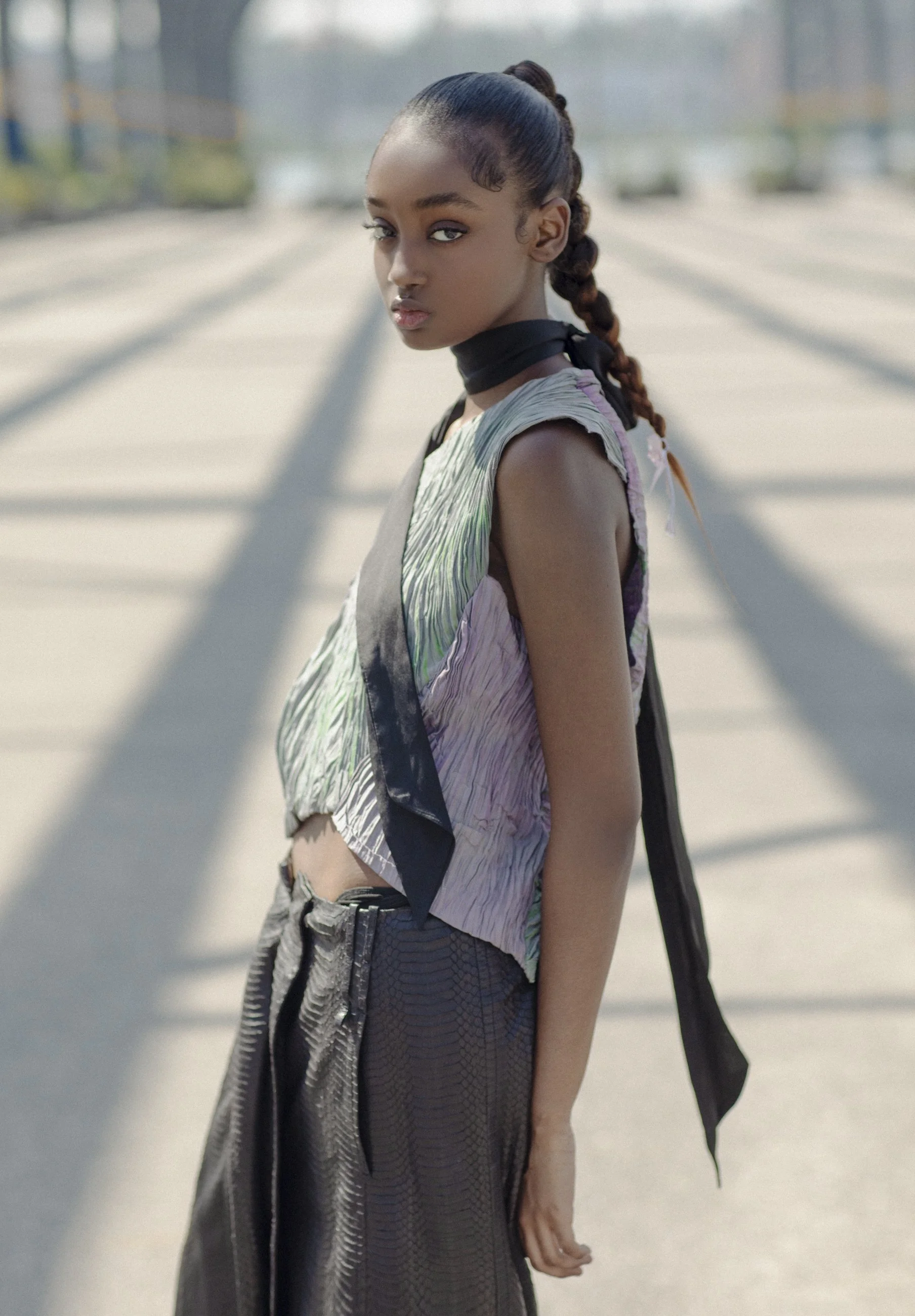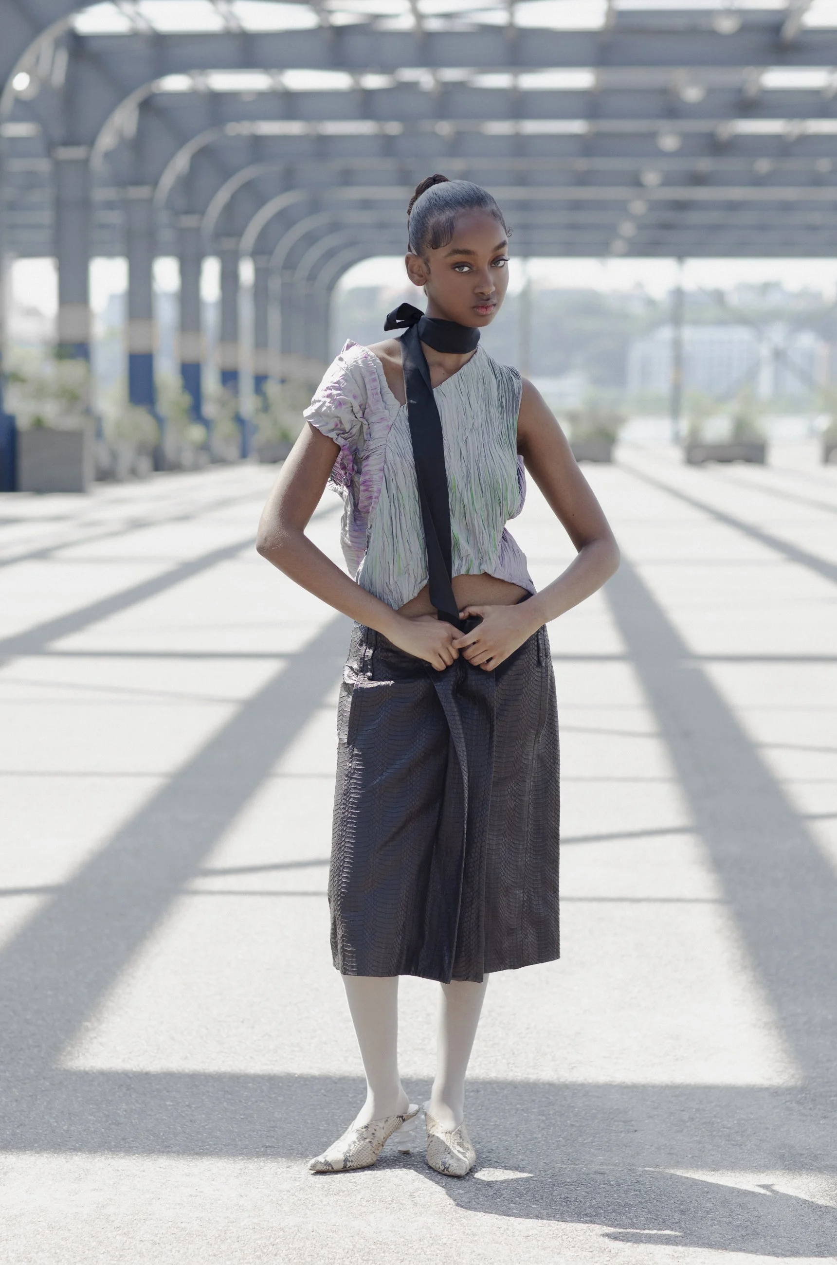 Inspired by Mariano Fortuny’s fusion of artistry and innovation, this piece explores the dialogue between texture, light, and movement. The silk was hand-painted and then pleated, allowing color and form to shift organically — capturing the fluidity and timeless elegance of Fortuny’s legacy in a contemporary expression.