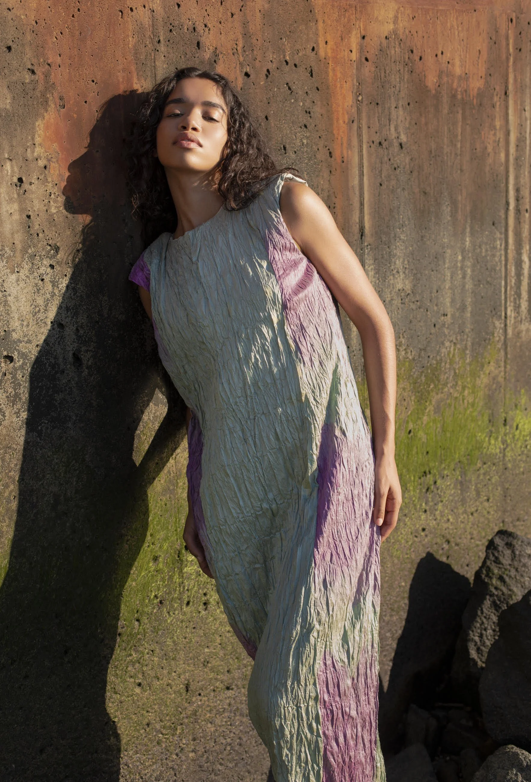 The fabric was hand-dyed using layered pigment applications to achieve depth and tonal variation. Each stage involved controlled immersion and brushwork, allowing the color to flow naturally across the silk. The process embraced irregularity and chance, resulting in a surface that feels both organic and intentional — a modern interpretation of Fortuny’s painterly approach to textiles.