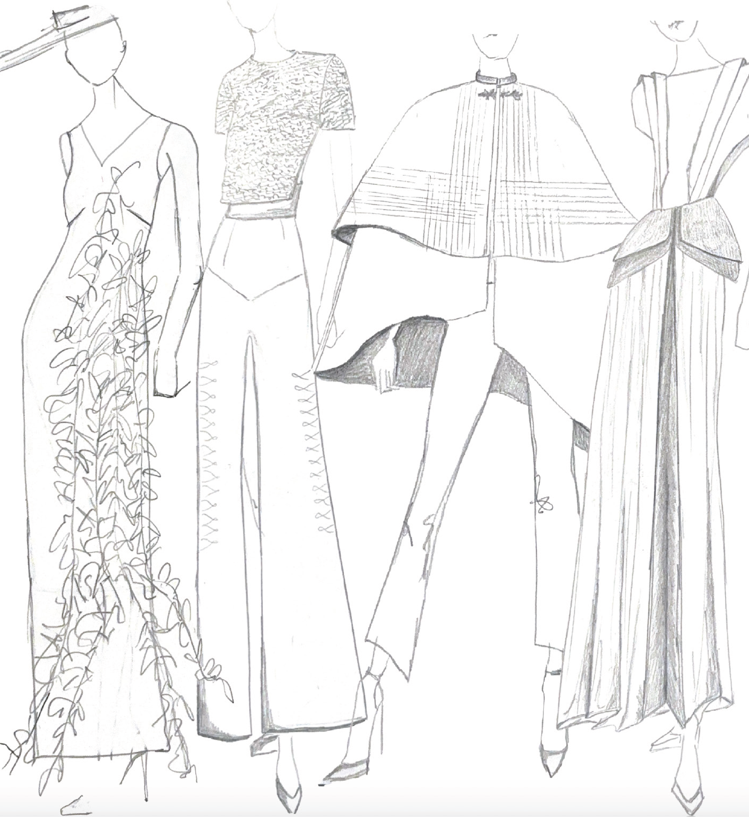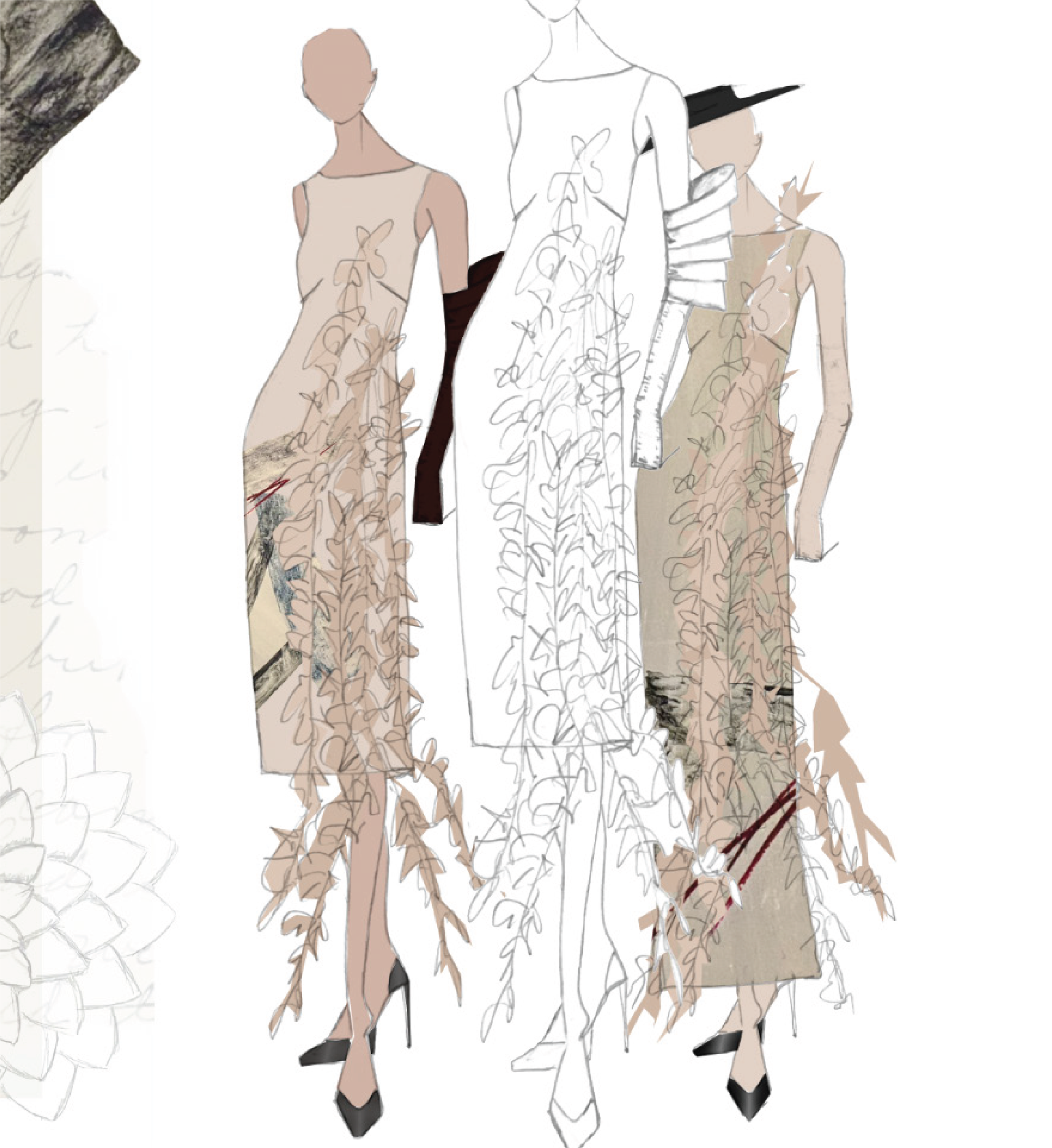I abstracted the contours and natural repetition of Spanish landscapes, like terraced farms and meandering rivers, to create fluid patterns. These reflect the contrast between nature’s organic flow and humanity’s structured interventions, translating directly into surface embellishments and fabric manipulation.
